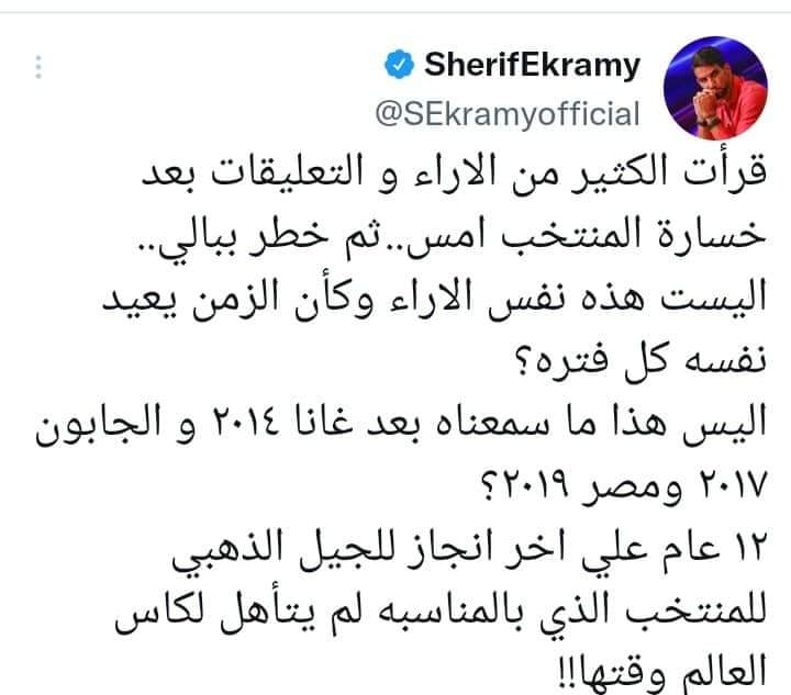 حيث نشر ” اكرامي “، عبر موقع التواصل الاجتماعي الخاص به” تويتر ‘”، قائلاً:” قرأت الكثير من الاراء و التعليقات بعد خسارة المنتخب امس، ثم خطر ببالي، اليست هذه نفس الاراء وكأن الزمن يعيد نفسه كل فتره”.