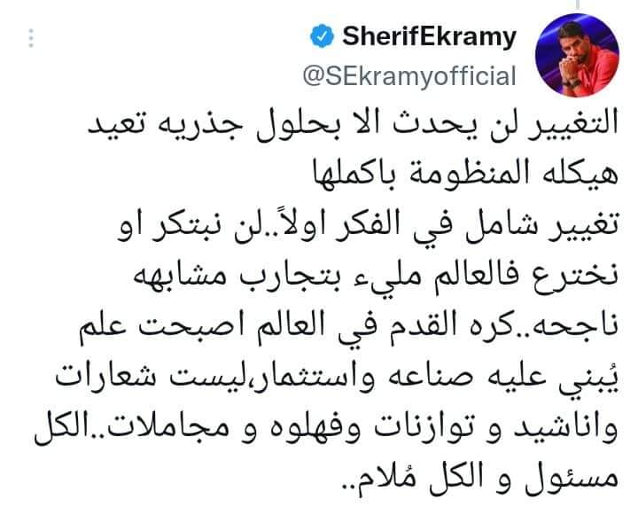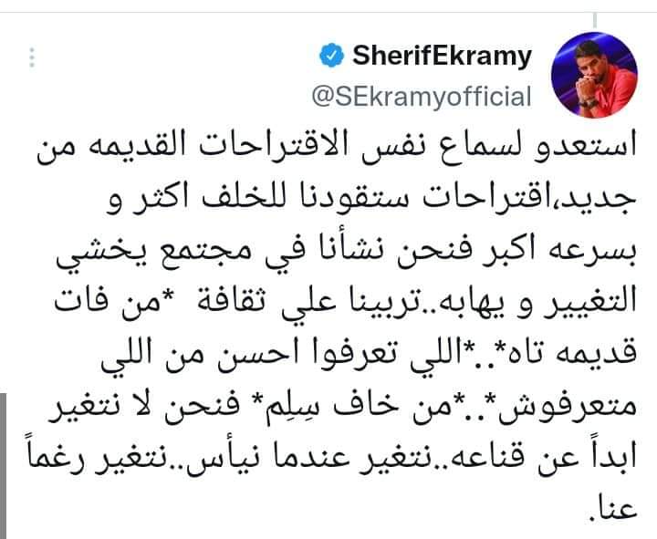 أردف:” استعدو لسماع نفس الاقتراحات القديمه من جديد،اقتراحات ستقودنا للخلف اكثر و بسرعه اكبر فنحن نشأنا في مجتمع يخشي التغيير و يهابه..تربينا علي ثقافة من فات قديمه تاه”.