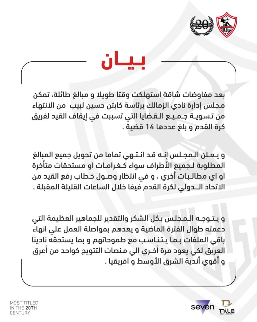 “بعد مفاوضات شاقة أستهلكت وقتاً طويلاً و مبالغ ضخمة، نجح مجلس إدارة الزمالك في تسوية جميع القضايا التي تسببت في إيقاف القيد لفريق الكرة، و عددها 14 قضية.