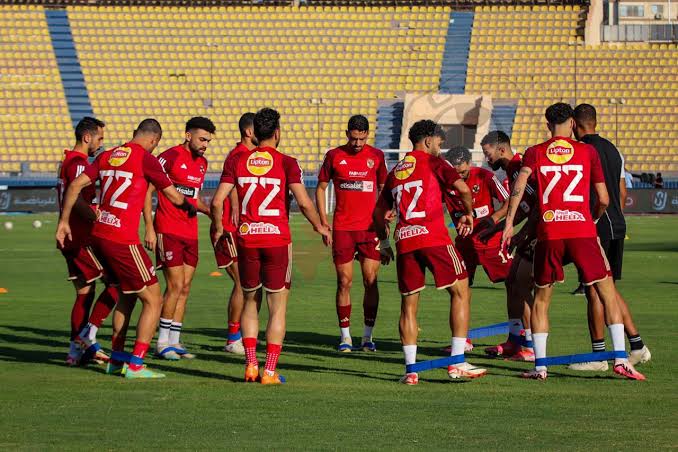 يقوم الفريق الأول للنادي الأهلي بإجراء عمليات الإحماء بعد وصوله إلى ملعب المباراة.