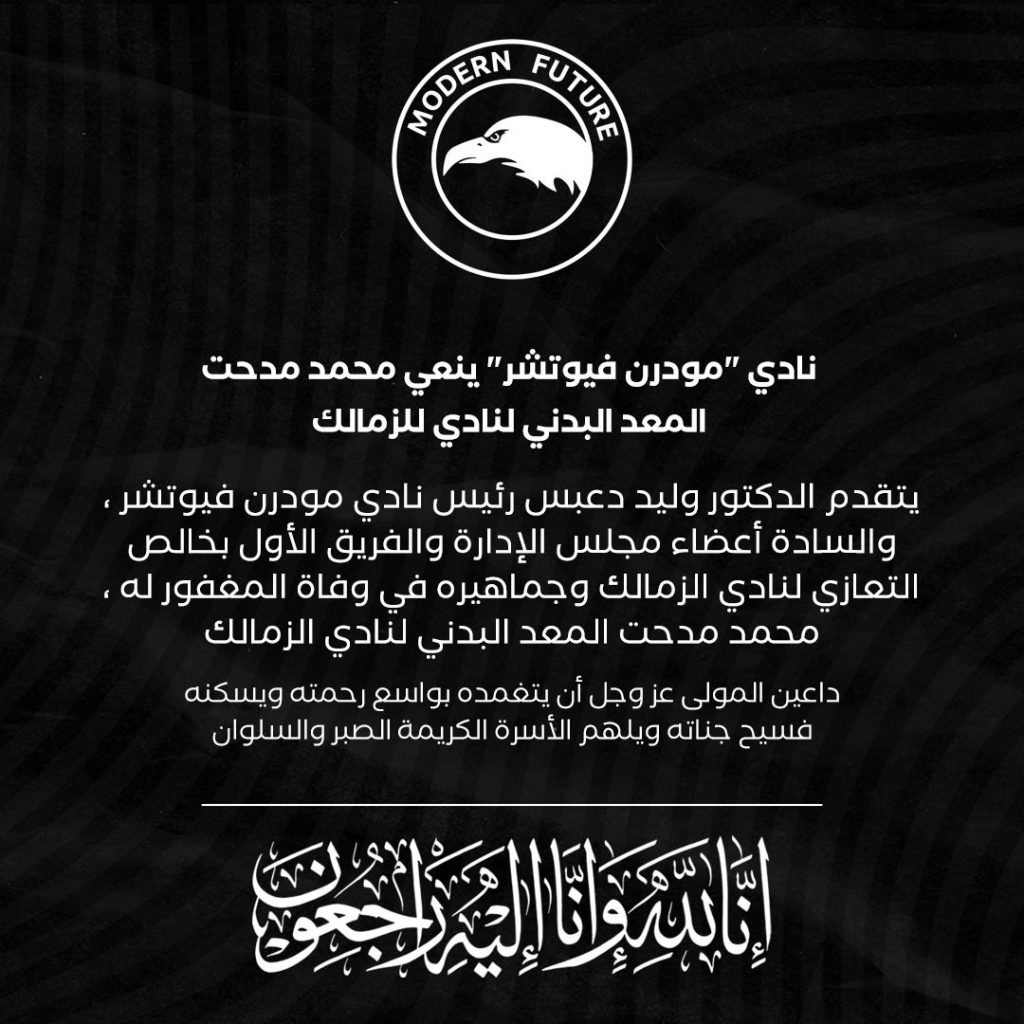” يتقدم الدكتور وليد دعبس رئيس نادي فيوتشر و السادة أعضاء مجلس إدارة النادي و الفريق الأول لكرة القدم بخالص التعازي لنادي الزمالك و جماهيره في وفاة المغفور له محمد مدحت المعد البدني بالنادي”.