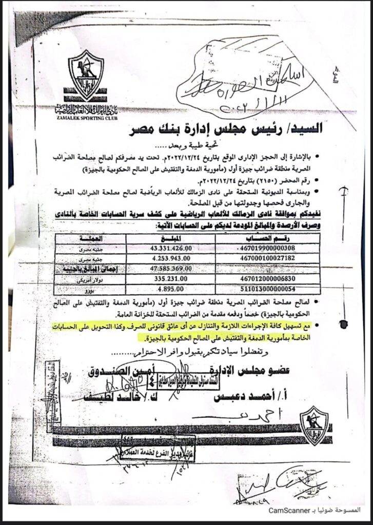 وكان مرتضى منصور الرئيس السابق لنادى الزمالك قد طلب رسمياً من وزارة المالية بالحجز على حساب النادي ببنك مصر وتم توجيه خطاب إلى بنك مصر والذي طلب فيه أمين صندوق الزمالك وقتها من البنك تسهيل كافة الإجراءات اللازمة ليتم حجز مصلحة الضرائب على حسابات نادي الزمالك وصرف وتحويل المبالغ الموجود بالحسابات إلى مصلحة الضرائب بل والتنازل عن أي عائق قانوني يعوق الصرف نكايه بممدوح عباس؟وبالفعل تم تحويل كافة المبالغ المحجوز عليها لمصلحة الضرائب المصرية والتي كانت مودعه بحسابات نادي الزمالك المختلفة وايس ببنك مصر فقط وهو مالم يكن فى حسابات مرتضى منصور وقتها رغم انه رجل قانون شهير ؟!