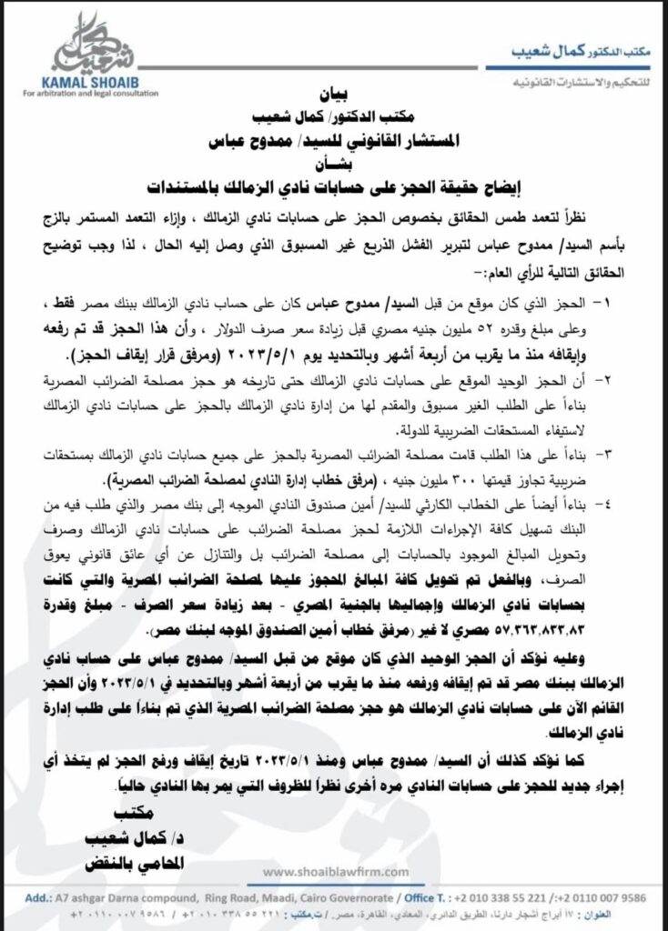 أصدر المحامي كمال شعيب وكيل المهندس ممدوح عباس رئيس نادي الزمالك السابق بيانا رسميا منذ ساعات قليلة أكد من خلاله بأن الحجز الوحيد الذي كان موقع من قبل ممدوح عباس على حساب نادي الزمالك ببنك مصر قد تم إيقافه وانتهاء فاعليته منذ حوالي أربعة أشهر ماضية وبالتحديد اول شهر مايو لهذا العام .